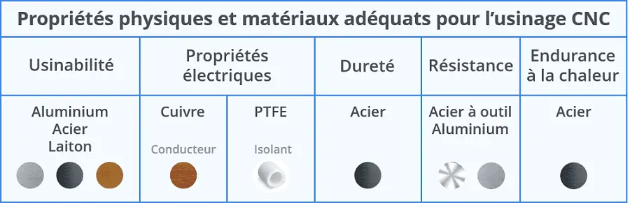 Un certain nombre d’exigences et de facteurs distincts permettent de déterminer quel matériau est le plus adapté à un projet d’usinage CNC. Par exemple : avez-vous besoin d’un matériau avec d’excellentes propriétés mécaniques ? ou, à l’inverse, accordez-vous plus d’importance à la vitesse de fabrication ? Bien souvent, il s’agit de mettre en balance toute une série de critères afin d’avoir l’idée la plus juste du matériau nécessaire. Les critères présentés par la suite ne constituent pas une liste exhaustive, mais permettent néanmoins d’établir une base de réflexion saine quant au choix du matériau le plus approprié pour l’usinage CNC.
