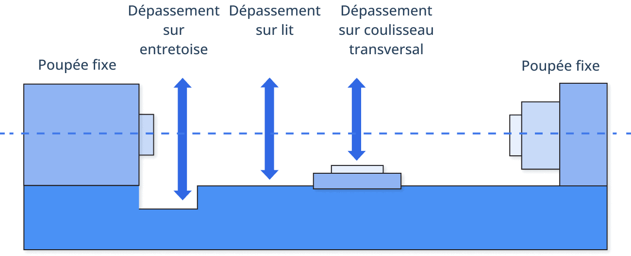 Les termes « dépassement sur lit », « dépassement sur coulisseau transversal » et « dépassement sur entretoise » définissent différentes mesures de dégagement sur un tour. Le dépassement sur lit indique le diamètre maximum qui peut être usiné au-dessus du guide longitudinal du lit.