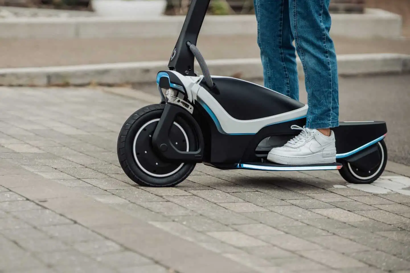 Cette trottinette électrique comporte à la fois des éléments de sécurité actifs et passifs, allant du système d’éclairage sur tout le périmètre qui offre une grande visibilité lors de la conduite, à la grande roue avant qui aide à absorber les irrégularités de la route et même la position de conduite, lorsque les utilisateurs se tiennent debout, les pieds tournés vers l’avant, ou à cheval sur le milieu de la trottinette électrique.