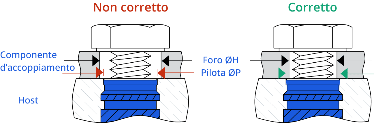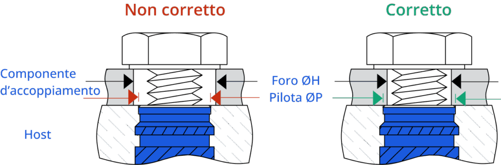 Anche il diametro del foro passante nel componente di accoppiamento è importante. L’inserto, non la plastica, deve sostenere il carico. Il foro nel componente di accoppiamento deve essere più grande del diametro esterno della vite ma più piccolo del diametro pilota o frontale dell’inserto. Ciò impedisce problematiche sull’accoppiamento.