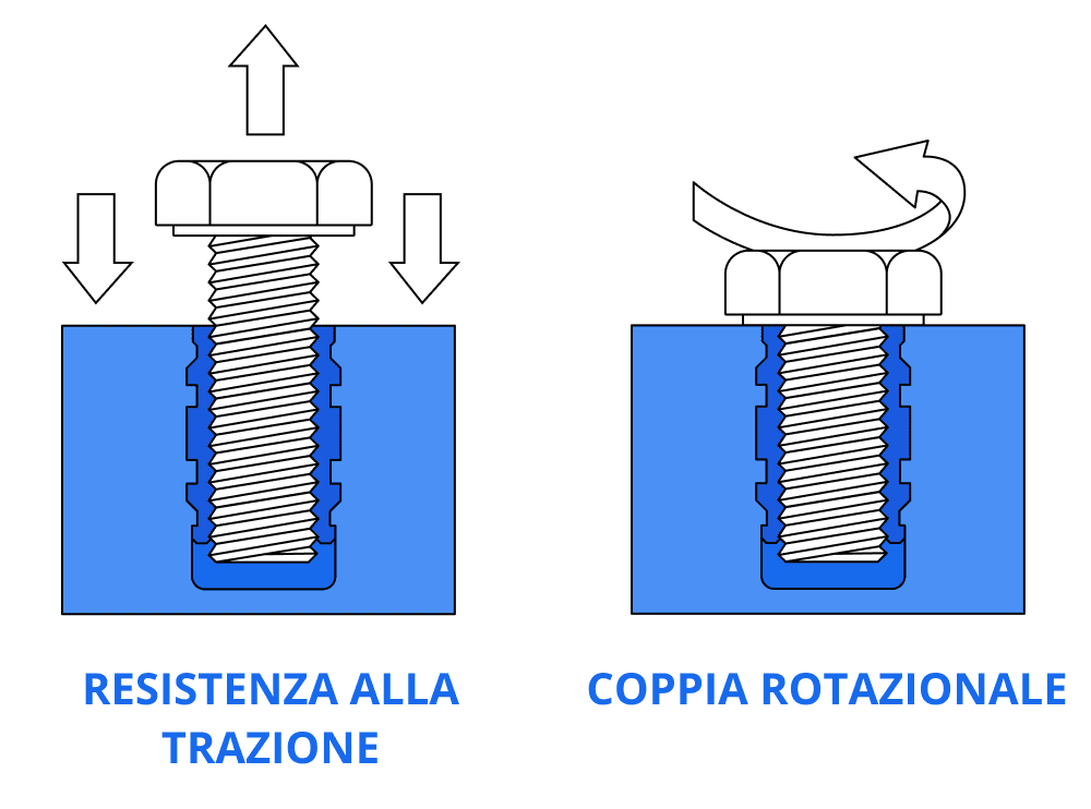 I fattori chiave di resistenza degli inserti sono la resistenza all’estrazione dalla parte (forza di estrazione) e alla torsione interna quando il dispositivo di fissaggio accoppiato viene serrato (forza di torsione). Un inserto più lungo aumenta la resistenza allo sfilamento, mentre un inserto di diametro maggiore migliora la capacità di coppia.