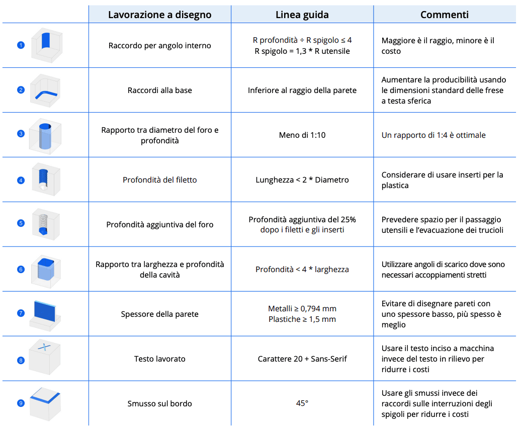 La tabella seguente riassume le linee guida di progettazione associate alle varie funzionalità che possono essere realizzate mediante il CNC. Il suo scopo è aiutare i progettisti a ottimizzare i componenti in vista della produzione.