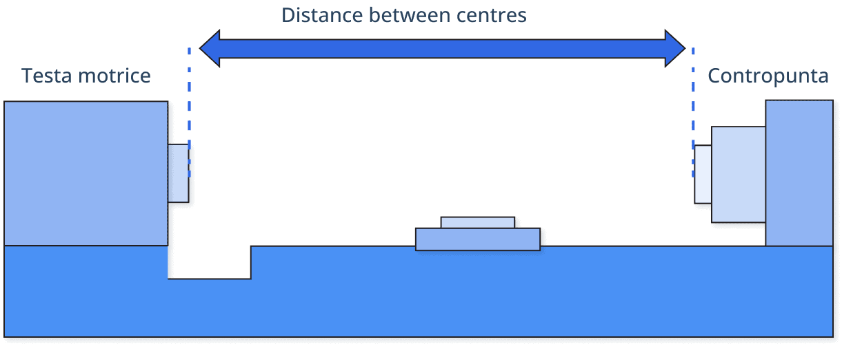 Per un tornio CNC, la distanza tra i centri si riferisce alla distanza tra la testa del tornio e la contropunta. Ciò limita la lunghezza massima totale lavorabile del componente.