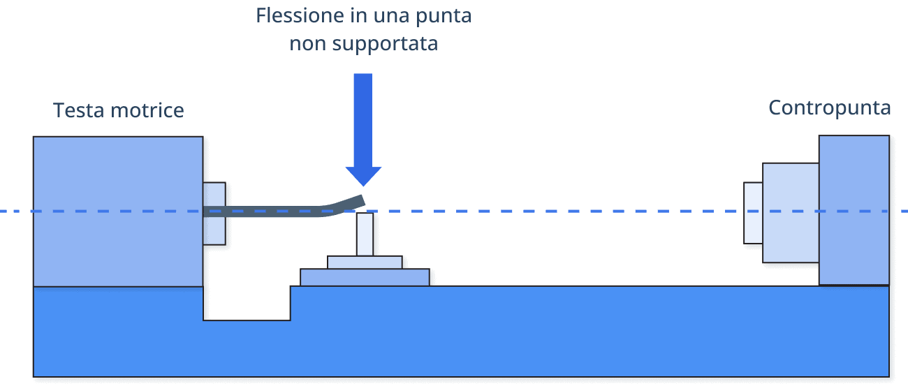 Nelle operazioni tipiche di tornitura CNC, il pezzo in lavorazione viene fissato nella testa e supportato dalla contropunta. Tuttavia, per alcune attività, il pezzo in lavorazione è montato solo sulla testa. In questi casi, il tipo di materiale e lo spessore determinano la lunghezza consentita del pezzo in lavorazione, poiché una lunghezza eccessiva può causare flessioni e potenziali problemi.