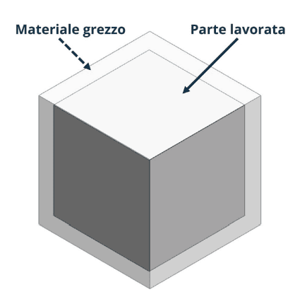 Questo aspetto si riferisce alla dimensione della materia prima utilizzata per creare la parte finita. Il materiale grezzo in genere deve essere leggermente più grandi delle misure della parte finita per consentire variazioni e per rimuovere le superfici ruvide della materia prima.