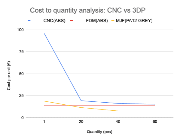 Conclusione: procedi con la stampa 3D per piccole serie e procedi con la lavorazione CNC per serie medio-grandi poiché il costo si riduce con la quantità e diventa molto inferiore. Considera la stampa 3D MJF per le serie di medie dimensioni poiché la tecnologia consente di stampare più parti contemporaneamente, il che riduce il prezzo per unità.