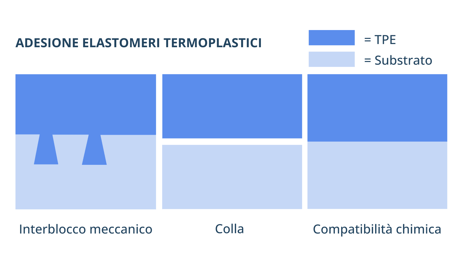 La tabella seguente fornisce un confronto tra substrati comuni, le loro caratteristiche principali e la loro compatibilità di legame con i TPE: