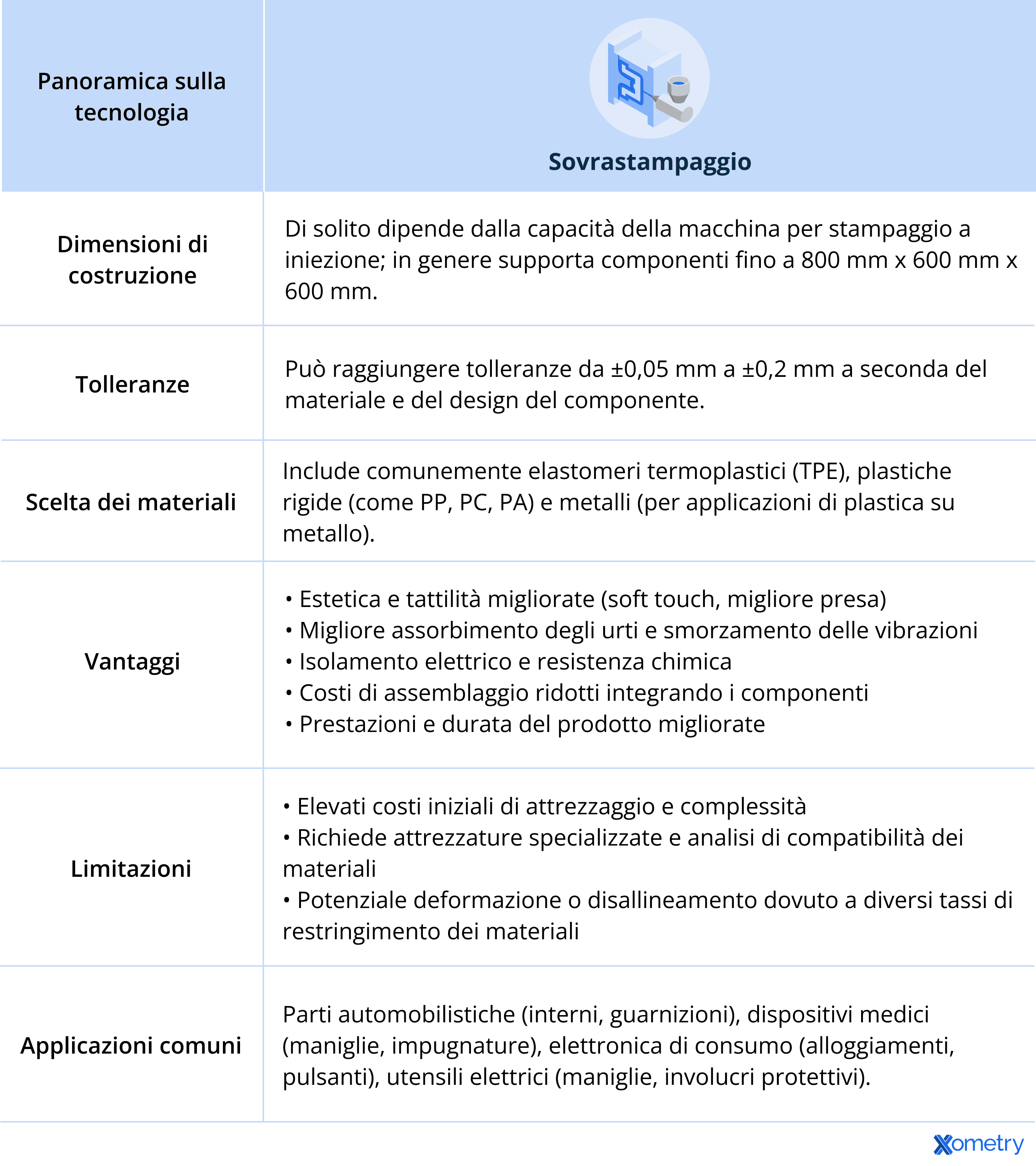La tabella seguente fornisce una panoramica concisa dei principali dettagli tecnici, materiali e vantaggi dello stampaggio a iniezione.