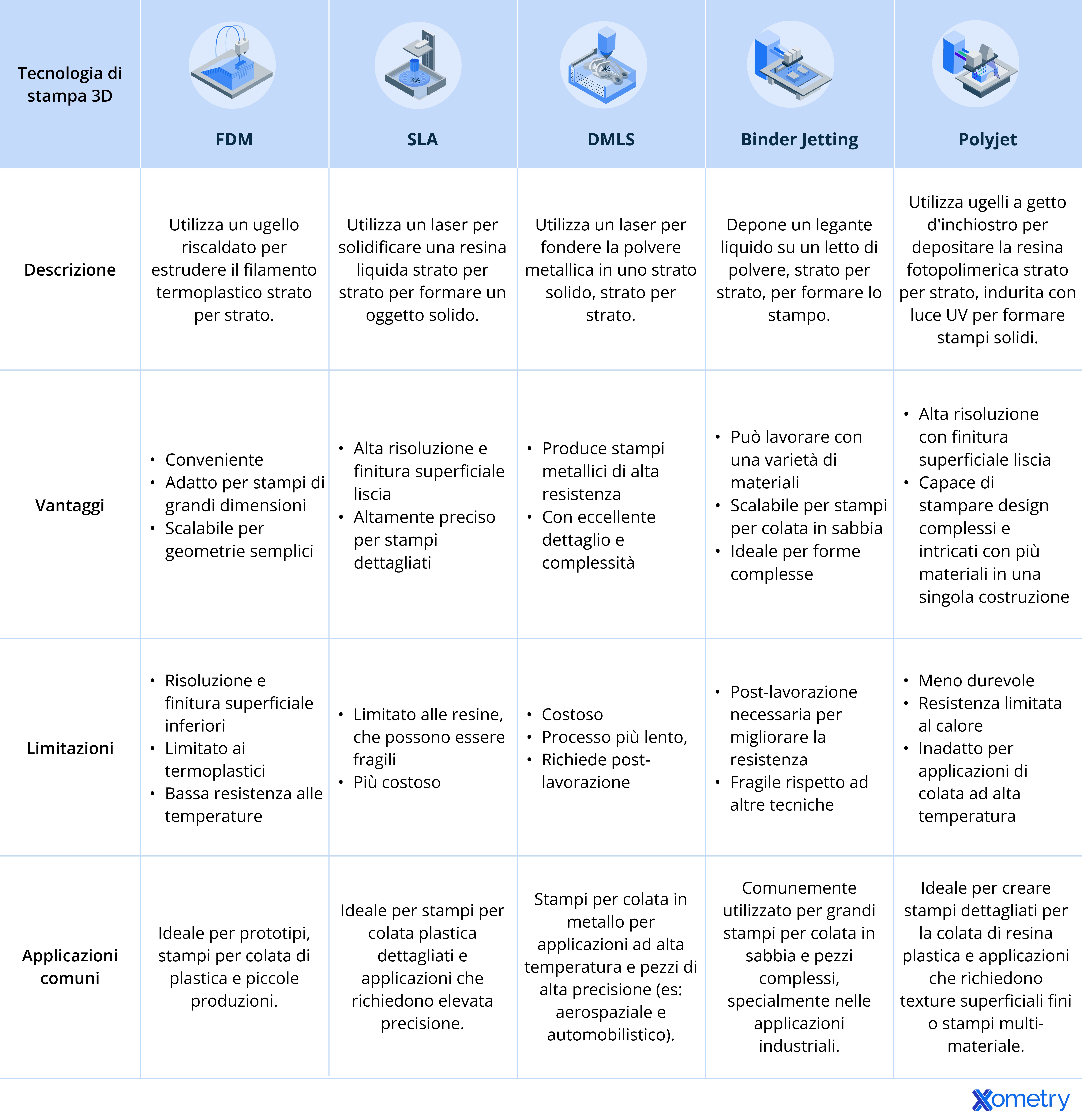 Per realizzare stampi di fusione si possono impiegare diverse tecnologie di stampa 3D. La scelta della tecnologia dipende spesso da fattori quali il materiale di fusione, la complessità dello stampo e la finitura superficiale desiderata. Le 5 tecnologie di stampa 3D più comunemente utilizzate per la fabbricazione di stampi offrono vantaggi unici in termini di costi, risoluzione e idoneità per diversi materiali: