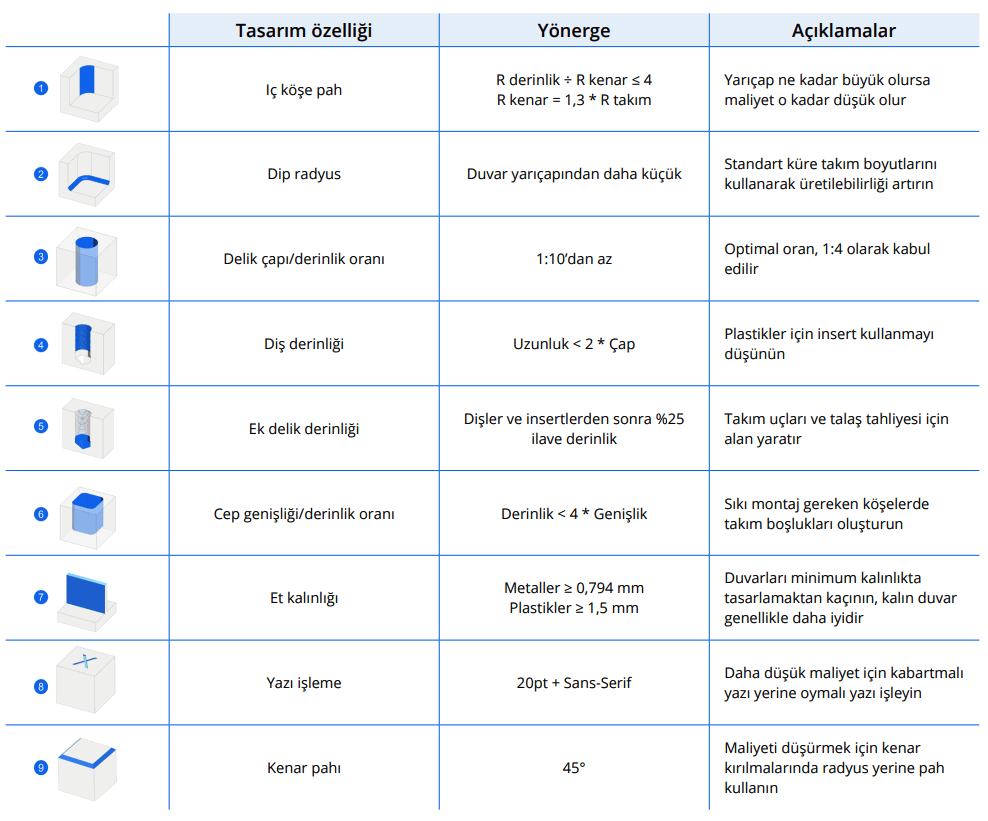 Aşağıdaki tabloda, CNC kullanılarak üretilebilecek çeşitli özelliklerle ilişkili tasarım kuralları özetlenmiştir. Tablonun kullanım amacı, tasarımcıların bileşenleri üretilebilirlik için optimize etmelerine yardımcı olmaktır.