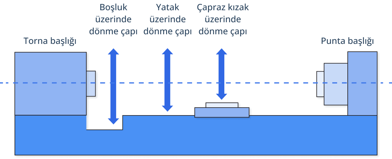 Swing Over Cross Slide (Çapraz Kızak Üzerinde Dönme Çapı), çapraz kızağın üzerinden çap uzunluğudur ve Swing Over Bed’den daha küçüktür. Swing Over Gap (Boşluk Üzerinde Dönme Çapı), flanşlar gibi daha büyük çaplı parçaların işlenmesine izin veren küçük bir boşluğu belirtir.