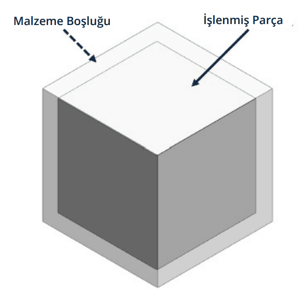 Örneğin, nihai boyutlar 50 x 50 x 50 mm olacaksa, buna uygun bir malzeme yaklaşık olarak 53 x 53 x 53 mm ebatlarında olacaktır. Tasarım yaparken bu dikkate alınmalı ve parçanın X, Y ve Z boyutlarına ekleme yapılarak bunlar aşağıdaki parça boyutu sınırlarına uygun hale getirilmelidir.