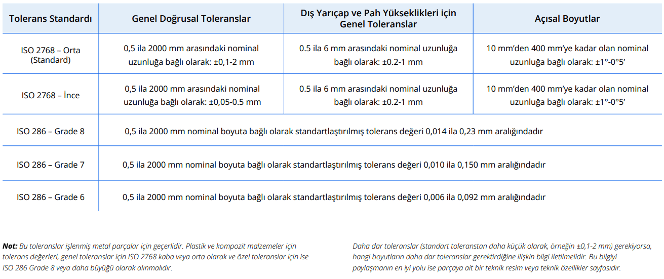 Tasarımcı tarafından özel olarak belirtilmediği sürece, Xometry aşağıda listelenen endüstri standardı ISO 2768 ve ISO 286 toleranslarına uyacaktır: