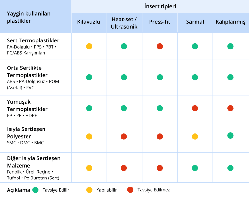 İnsertler için plastik seçenekleri arasında tercih yaparken termoplastikler ve termosetlerin farklı avantajlar sunduğu bilinmelidir. Birçok kez yeniden şekillendirilebilen termoplastikler (ör. PMMA/Akrilik, PC, ABS, PP, PEEK), termal ve ultrasonik insertler ile iyi çalışır. Bunun aksine, kalıplamadan sonra kalıcı olarak sertleşen termosetlerde (ör. epoksi, vulkanize kauçuk), kalıplanmış, basılarak takılan veya kendinden kılavuzlu (self-tapping) insertler gibi özel insertler kullanılması gerekir.