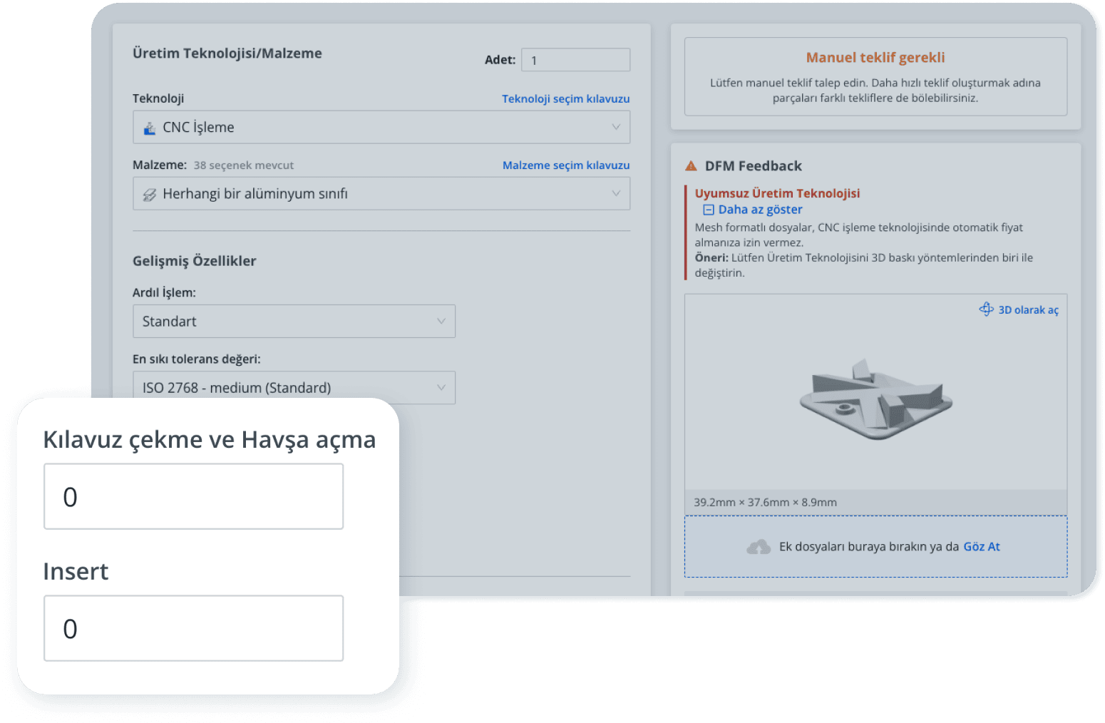 Not: Teknik çizim yükleme adımını atlayıp parçanızı sipariş etmeye devam ederseniz, satış mühendislerimiz insertlerinizle ilgili bilgileri netleştirmek için daha sonra sizinle iletişime geçecektir.