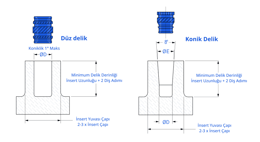 Düz deliklerde düz insertler kullanılmalı, konik deliklerde konik insertler kullanılmalıdır. Üretici, belirli bir insert için bir delikte olması gereken koniklik derecesini belirtecektir. Ancak standart öneri, düz delikler için en fazla 1 derece, konik delikler için en fazla 8 derece konikliktir.