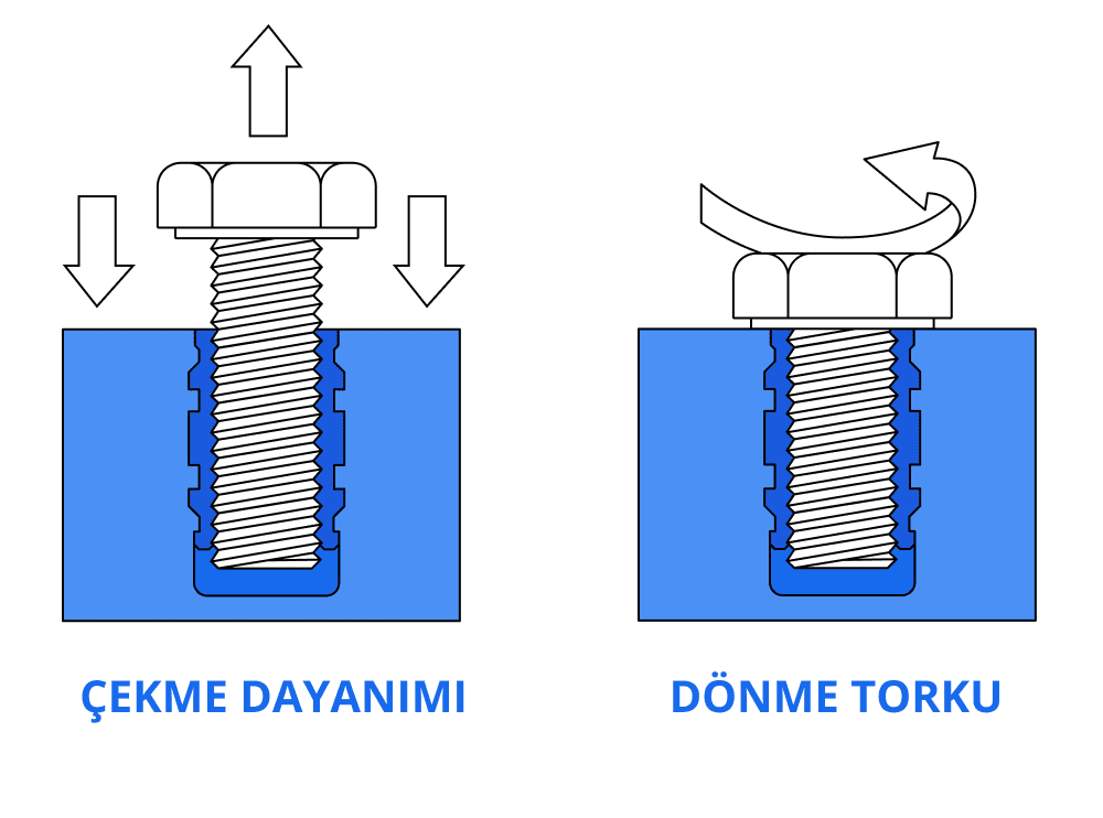 İnsertler için temel mukavemet faktörleri, parçadan dışarı çekilmeye (çekme kuvveti) ve eşleşen bağlantı elemanına tork uygulandığında parça içinde bükülmeye (dışarı tork kuvveti) karşı dirençleridir. İnsertin uzun olması, çekme direncini artırırken, çapının büyük olması, tork kapasitesini artırır.