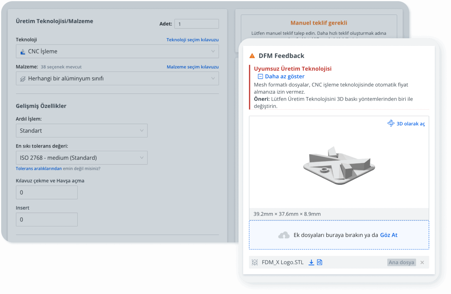 Proses ve malzeme hakkında şüpheleriniz mi var? Malzeme kütüphanemize ve 3D Baskı Sihirbazımıza göz atabilirsiniz. Ardından CAD dosyanızı Anlık Fiyat Motorumuza yükleyebilir ve birkaç tıklamayla fiyat teklifi alabilirsiniz.