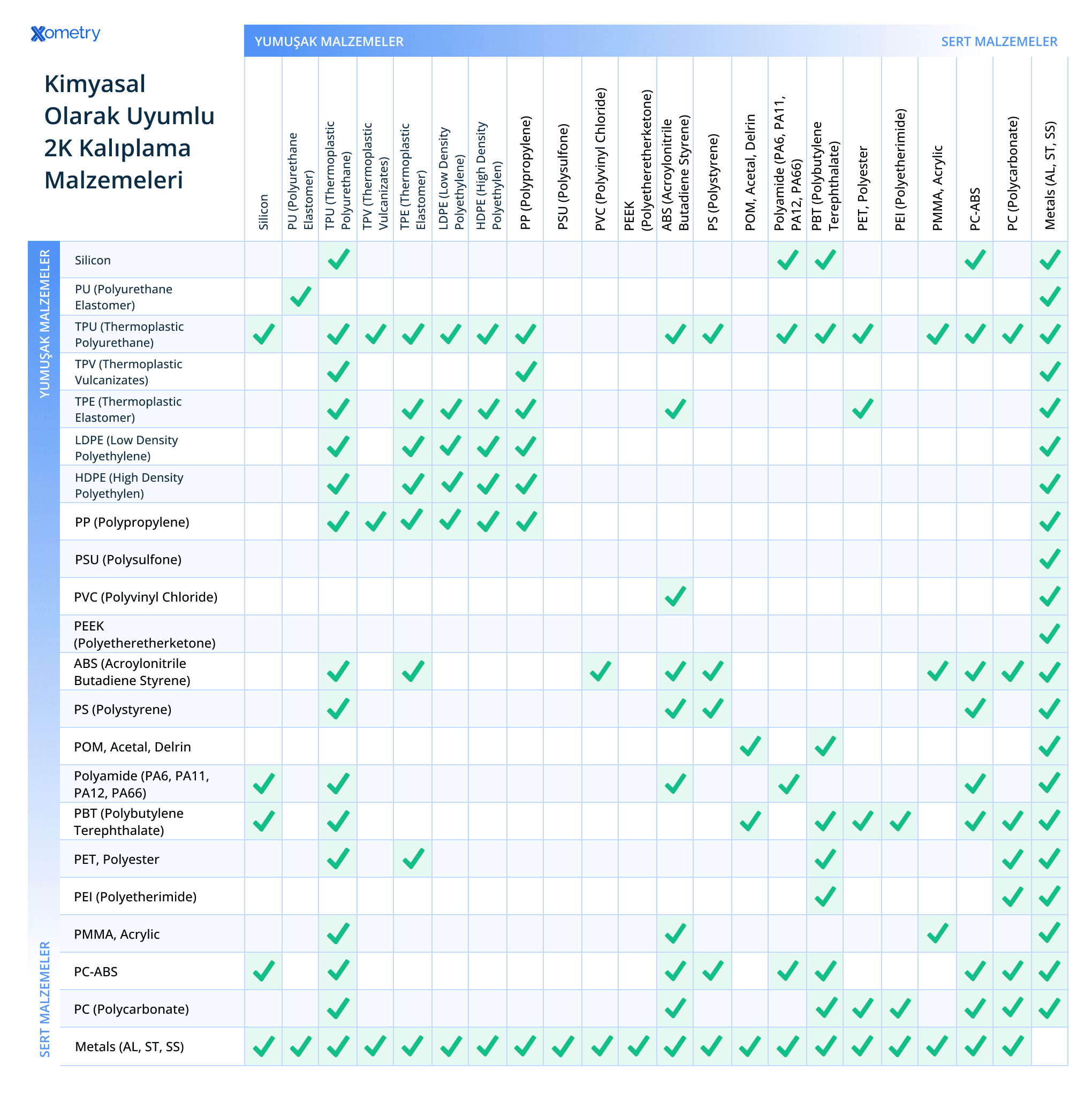 2K Kalıplamada malzemeler arasında güçlü, dayanıklı bağlanmalar elde etmek, ürün güvenilirliğini, gerilime karşı direnci ve uzun dönem performansı sağlamak için kimyasal uyumluluk zorunludur. Aşağıdaki tabloda, 2K kalıplama prosesleri için malzeme uyumluluğuna ilişkin kapsamlı bir özet sunulmakta, farklı yumuşak malzemelerin sert alt katmanlarla nasıl etkili bir şekilde bağlanabileceği gösterilmektedir.
