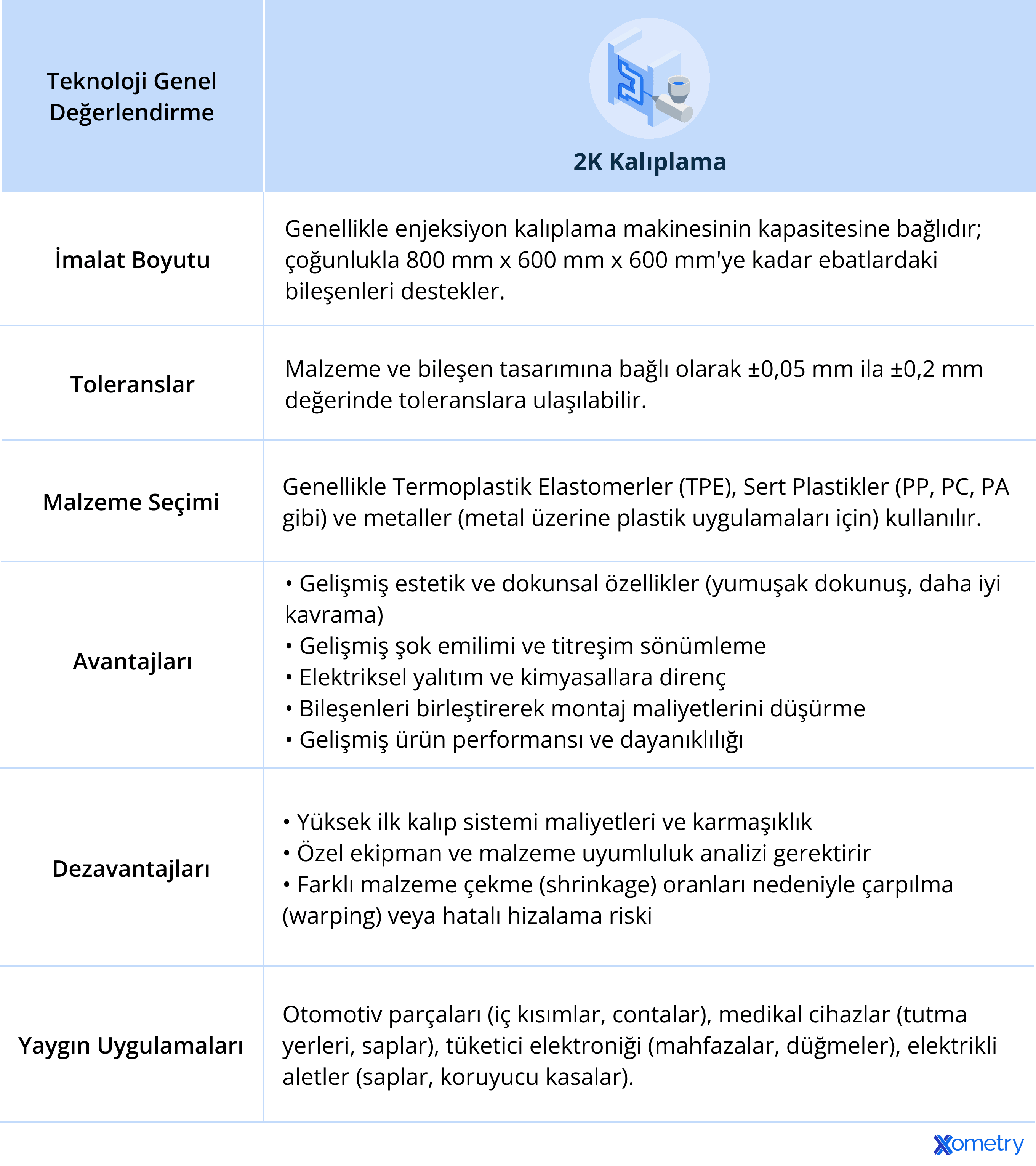 Aşağıdaki tabloda, 2K kalıplamanın temel teknik özellikleri, malzemeleri ve avantajları hakkında kısa bir genel bakış sunulmaktadır.